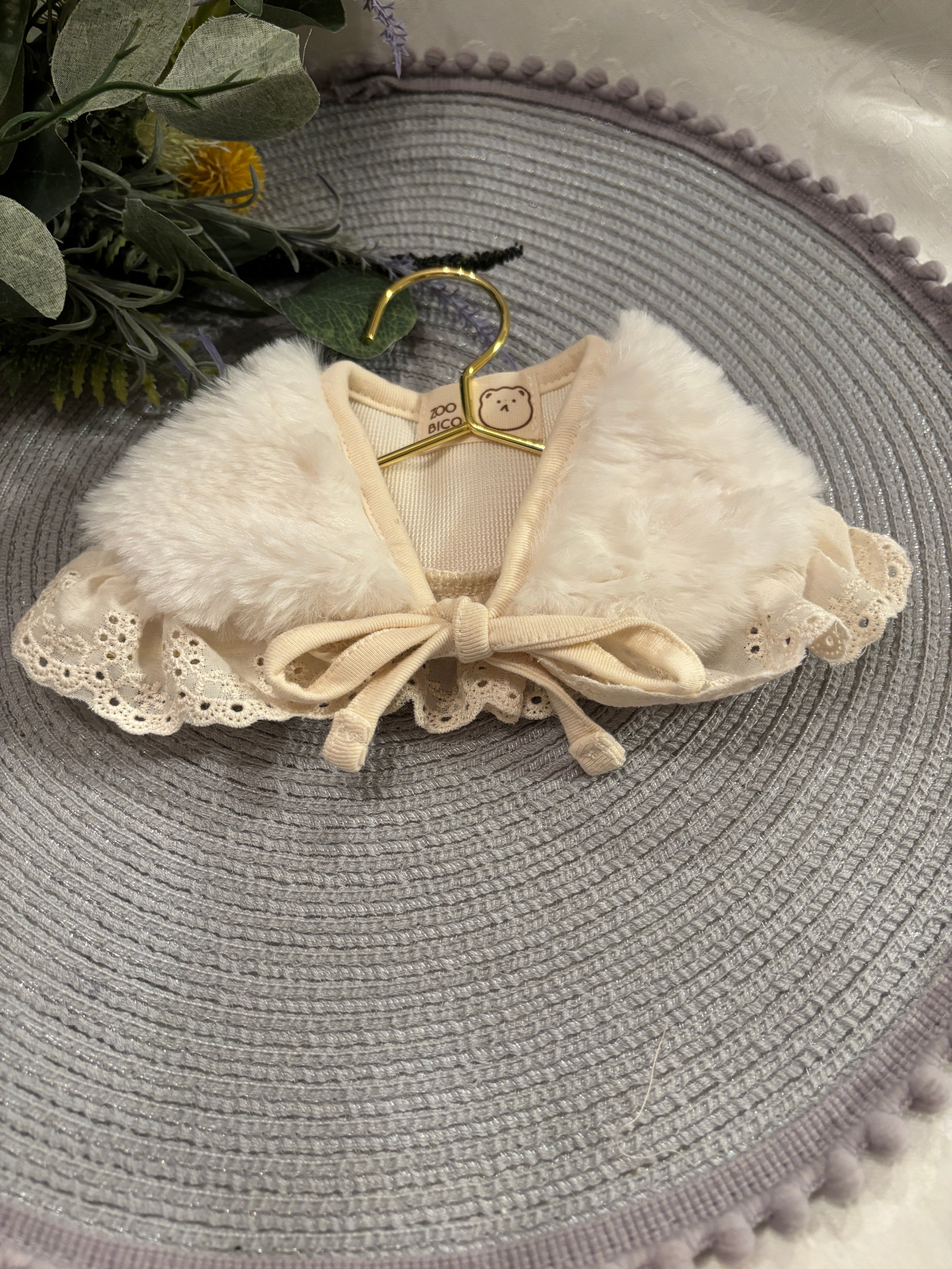 愛するペットの可愛さを引き立てる、ふわふわファー仕立てのスタイです。このアイテムは、やさしい肌触りと温かみのあるデザインが特徴で、寒い季節にもぴったりです。