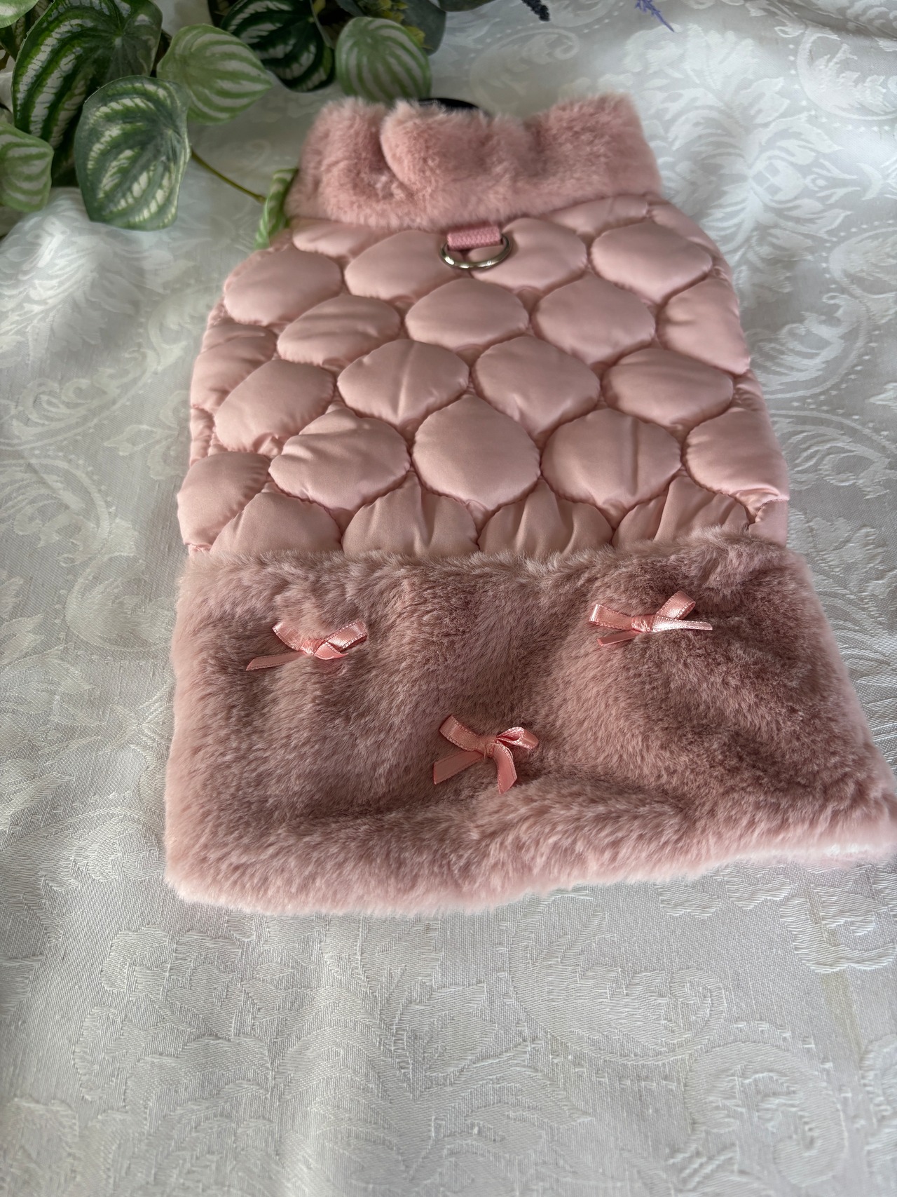 # 商品説明文:ペット用 冬仕様 キルティングコートフェイクファー&リボン